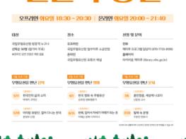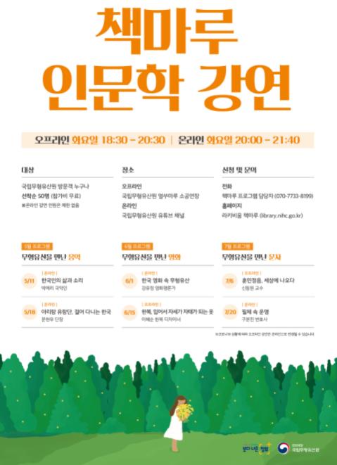 문화재청 국립무형유산원(원장 이종희)은 「책마루 인문학 강연」 문화프로그램을 오는 11일부터 7월 20일까지 온라인 강연 4회, 현장 강연 2회로 총 6회 시행한다.