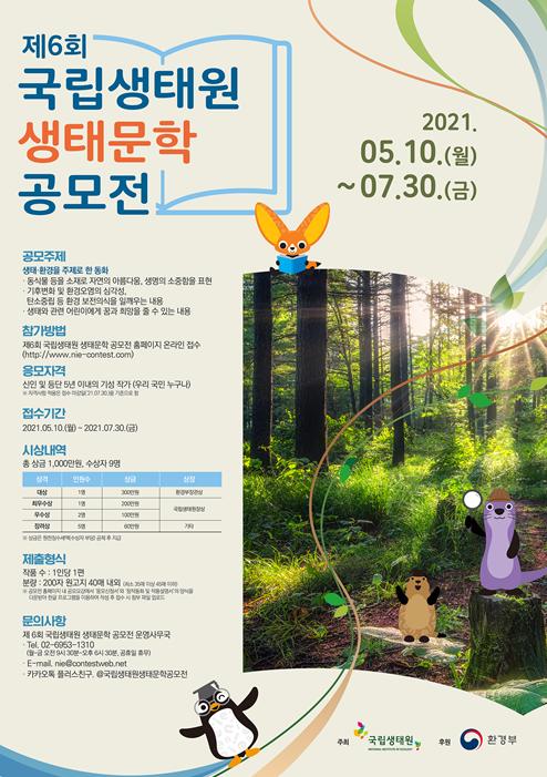 환경부 산하 국립생태원은 생태와 환경에 대한 이해와 생태적 감수성 함양을 위해 '제6회 국립생태원 생태문학(동화분야) 공모전'을 개최하고 5월 10일부터 7월 30일까지 작품을 접수한다.