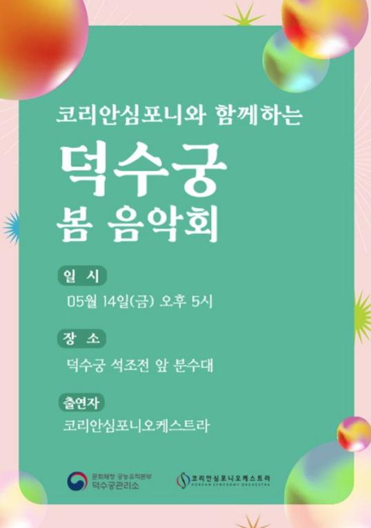 문화재청 궁능유적본부 덕수궁관리소는 (재)코리안심포니오케스트라(대표이사 박선희)와 함께 오는 14일, 오후 5시부터 석조전 분수대 앞에서 ‘덕수궁 봄 음악회’를 개최한다.