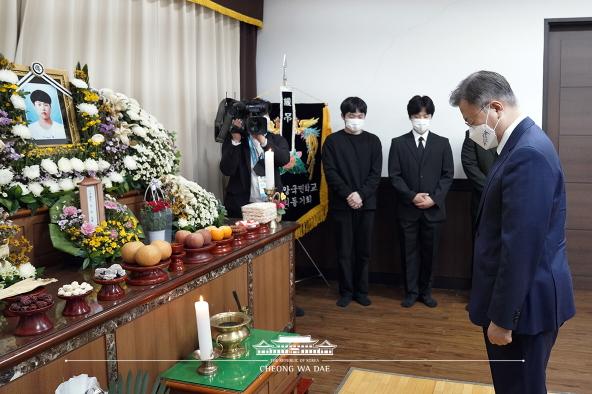 문재인 대통령은 13일 오후 평택항에서 일하다 산재사고로 숨진 故 이선호 씨의 빈소를 찾아 유가족을 위로했다.