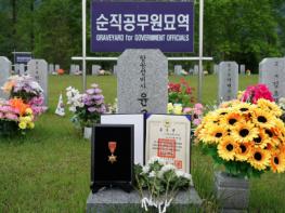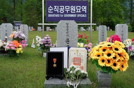 산림청은 5. 20일 대전 현충원에서 산불진화중 순직하신 고 윤규상 검사관의 묘역을 찾아 훈장을 추서하고 참배하였다.