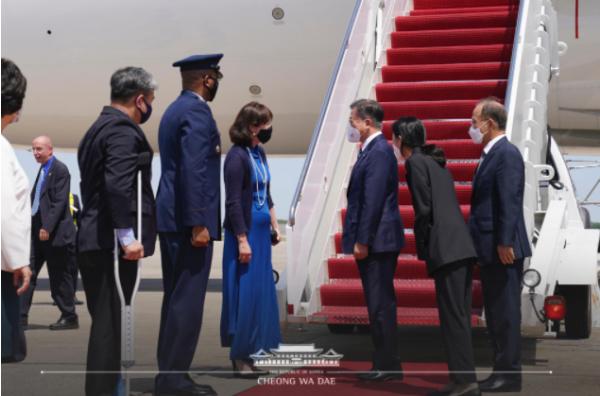 문 대통령은 마중 나온 로버츠 미 의전장, 이수혁 주미국대사, 이승배 워싱턴지구 한인연합회장 등과 주먹악수를 하며 환영인사를 나눴다.