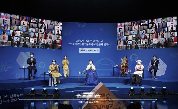 김정숙 여사는 20일 오후 2시에 외국인 한국문화 홍보 전문가 발대식에 참석하여 세계에서 활약하고 있는 한국문화 홍보 전문가들을 격려하고 응원했다.