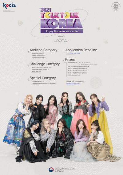 문화체육관광부 해외문화홍보원은 5월 25일부터 7월 15일까지 국제 한류 콘텐츠 공모전 ‘토크토크 코리아(Talk Talk Korea) 2021’을 진행한다.