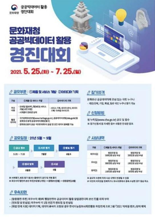 문화재청은 문화유산 공공데이터의 개방을 확대하고, 개방된 공공데이터의 활용도를 높이고자 ‘2021년 문화유산 공공데이터 활용 경진대회’를 개최한다.