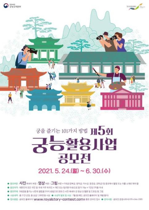 문화재청 궁능유적본부와 한국문화재재단은 국민이 궁궐을 즐기는 다양한 모습을 공유하기 위해「제5회 궁능활용사업 공모전」을 공모전 누리집을 통해 24일부터 6월 30일까지 접수받는다.