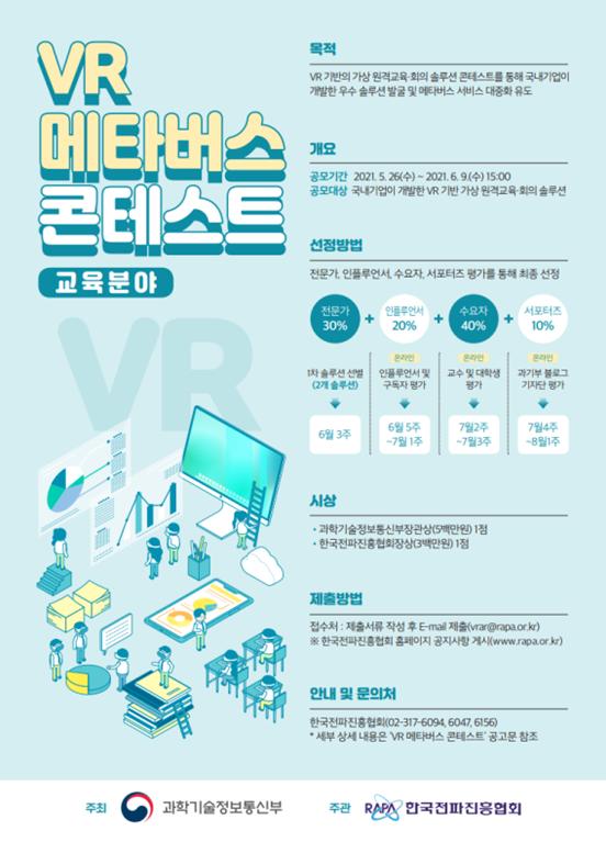 과학기술정보통신부는 미래 성장 산업으로 떠오르는 확장가상세계(메타버스)에 대하여 세계적으로 관심이 집중되는 가운데, 국내 우수 가상 원격교육·회의 솔루션 발굴 및 확장가상세계 서비스 확산을 위해「가상현실 확장가상세계 경연대회(VR 메타버스 콘테스트)」를 개최한다고 밝혔다.