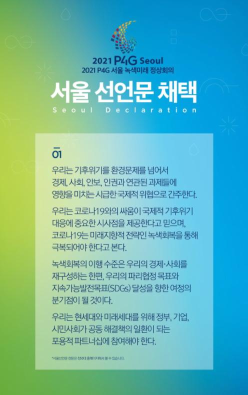 2021 P4G 서울 녹색미래 정상회의 결과문서로 서울선언문이 채택되었다.