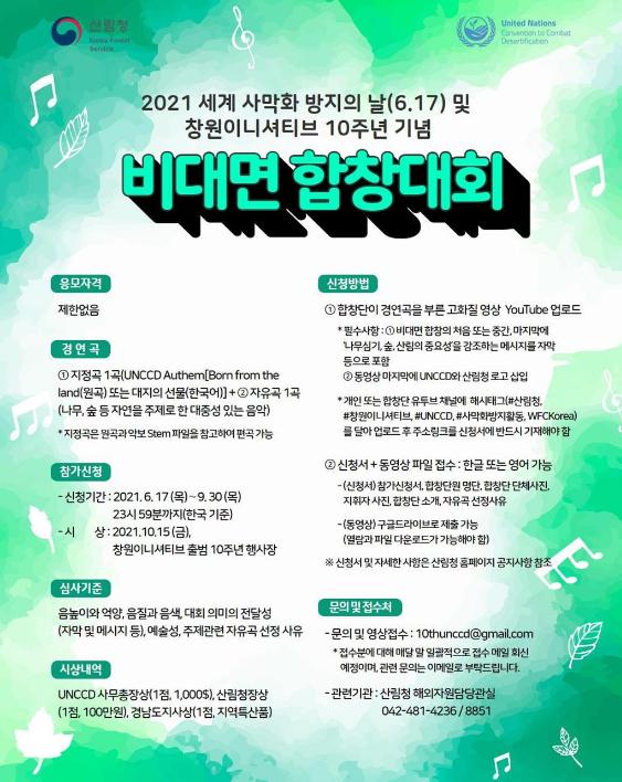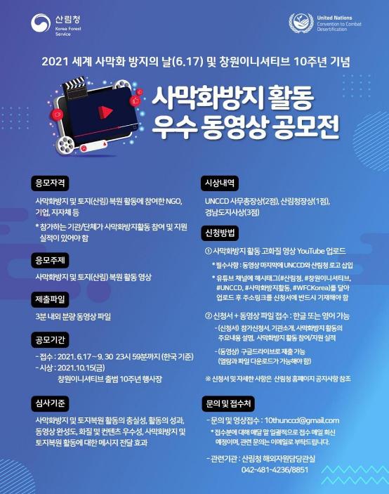 산림청은 2021년 세계사막화 방지의 날(6.17) 및 창원이니셔티브 출범 10주년을 기념하기 위해 ‘사막화방지 우수 동영상 공모전’과 ‘비대면 합창대회’를 6월 17일부터 9월 30일까지 진행한다.